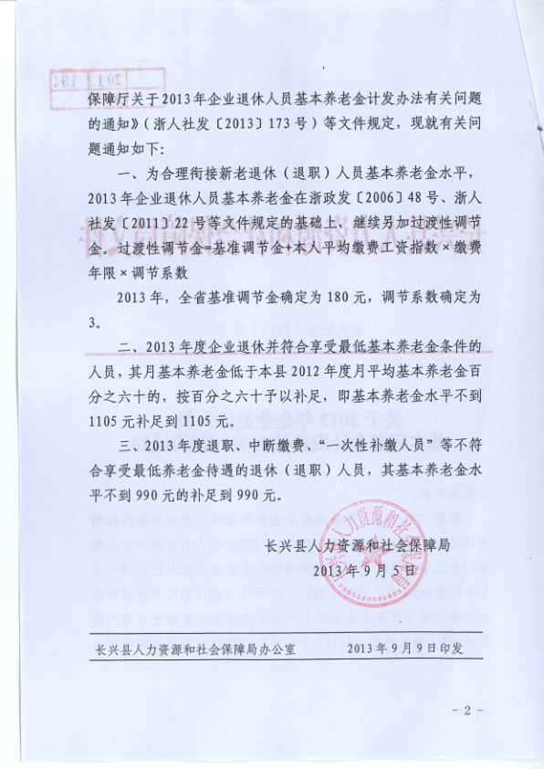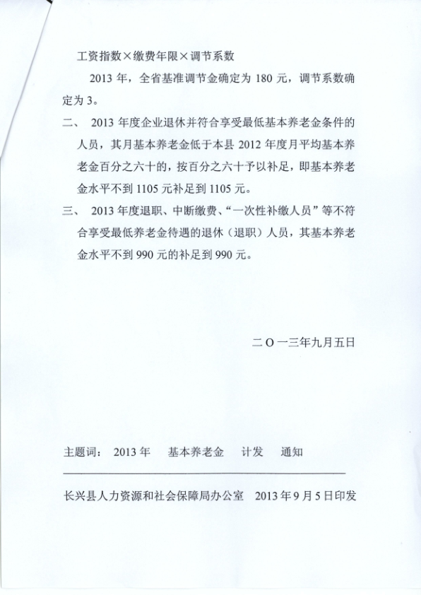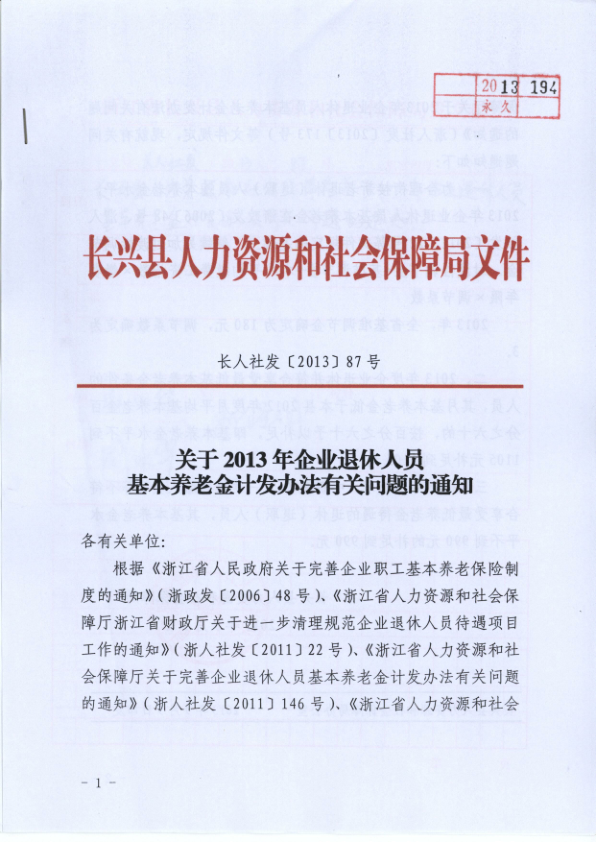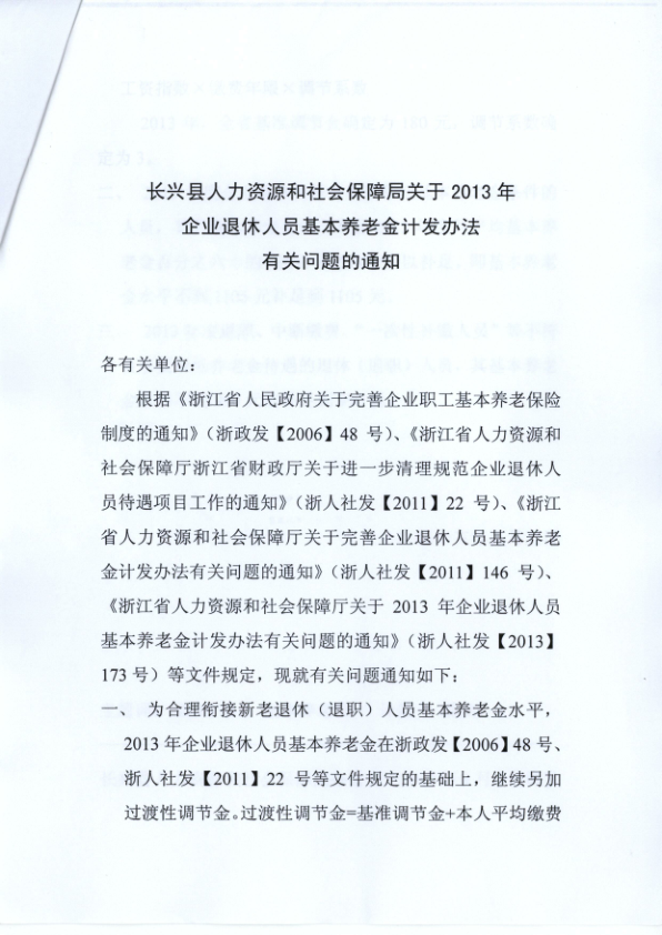 长兴县人力资源和社会保障局关于2013年企业退休人员基本养老金计发问题的通知