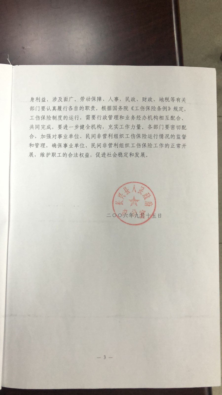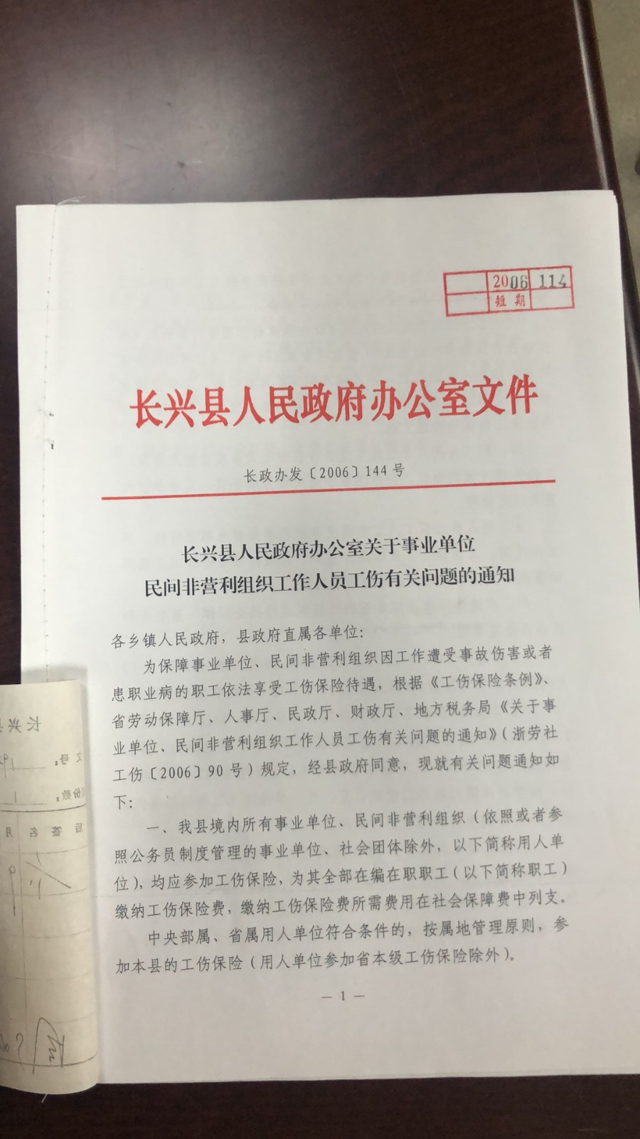 长政办发〔2006〕144号 长兴县人民政府办公室关于事业单位民间非营利组织工作人员工伤有关问题的通知