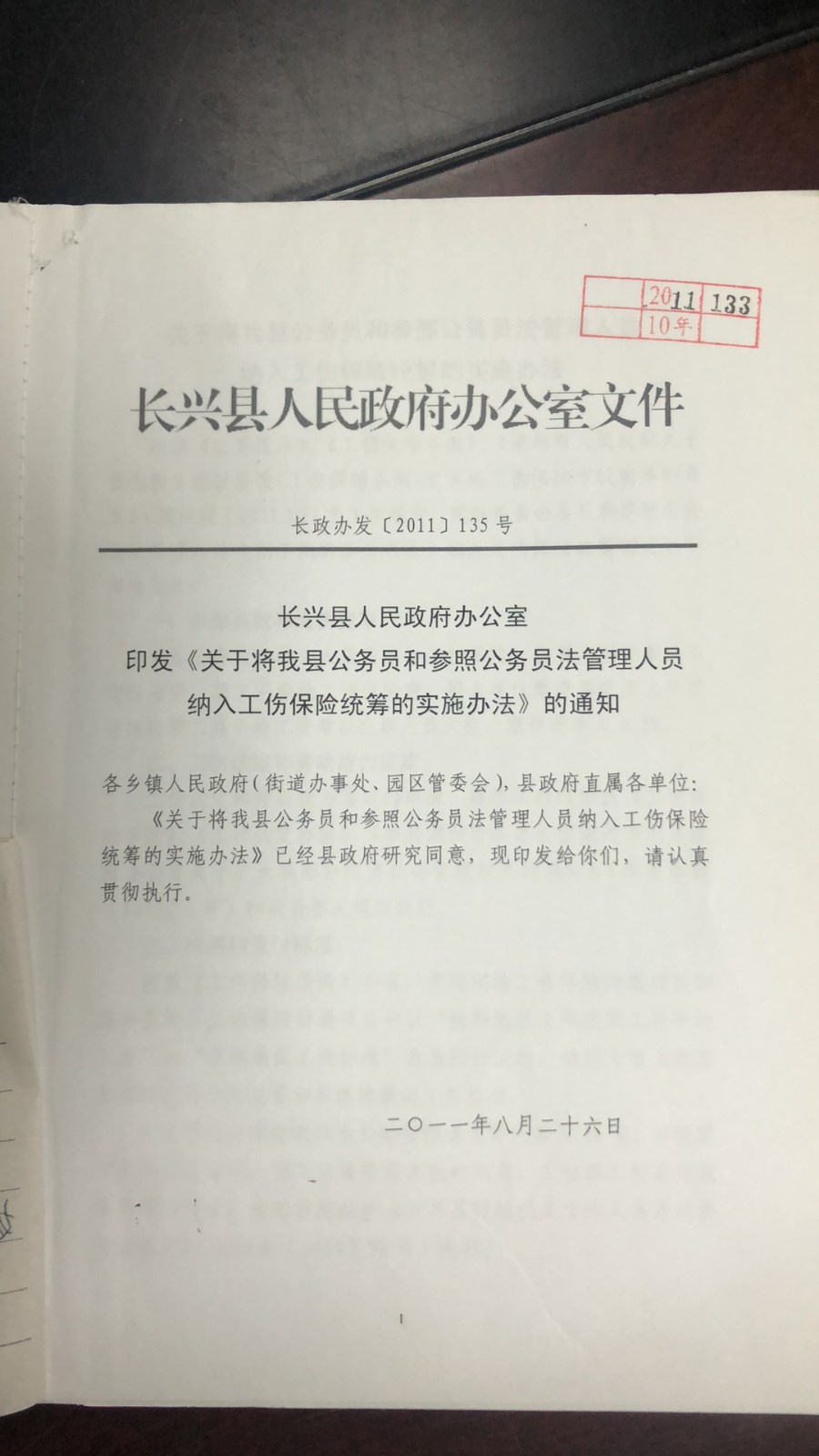 长政办发〔2011〕135号 长兴县人民政府办公室印发《关于将我县公务员和参照公务员法管理人员纳入工伤保险统筹的实施办法》的通知